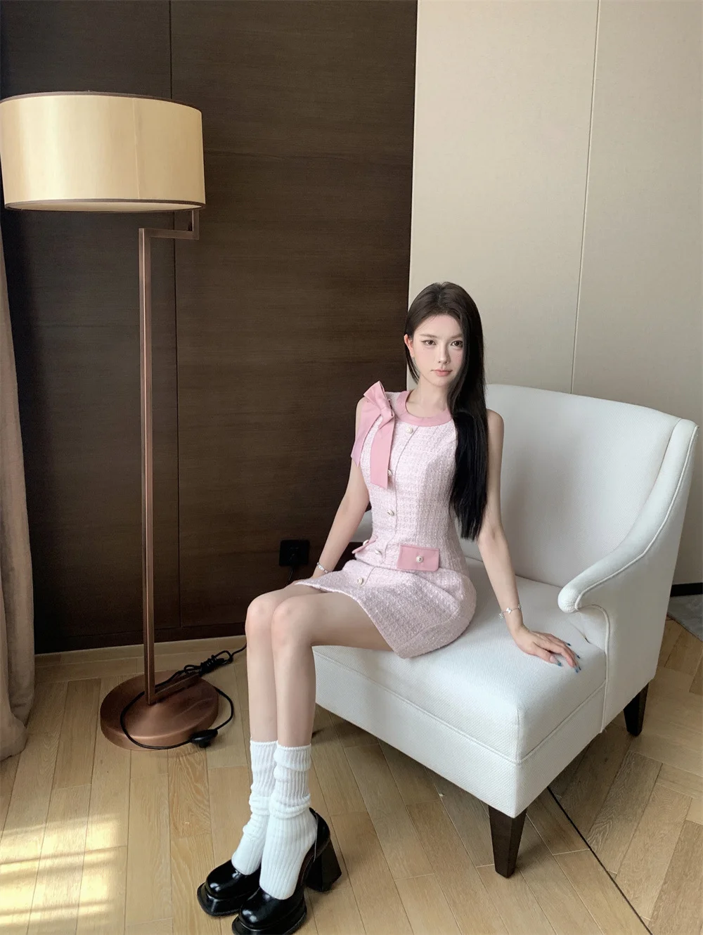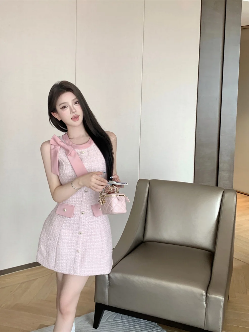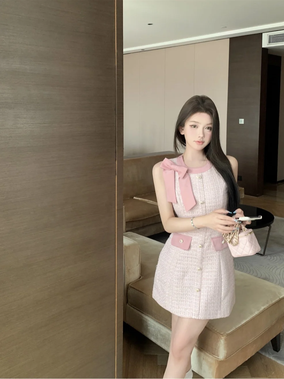 Women's Summer French Casual Bow Dress with Front Logo Elegant Pink